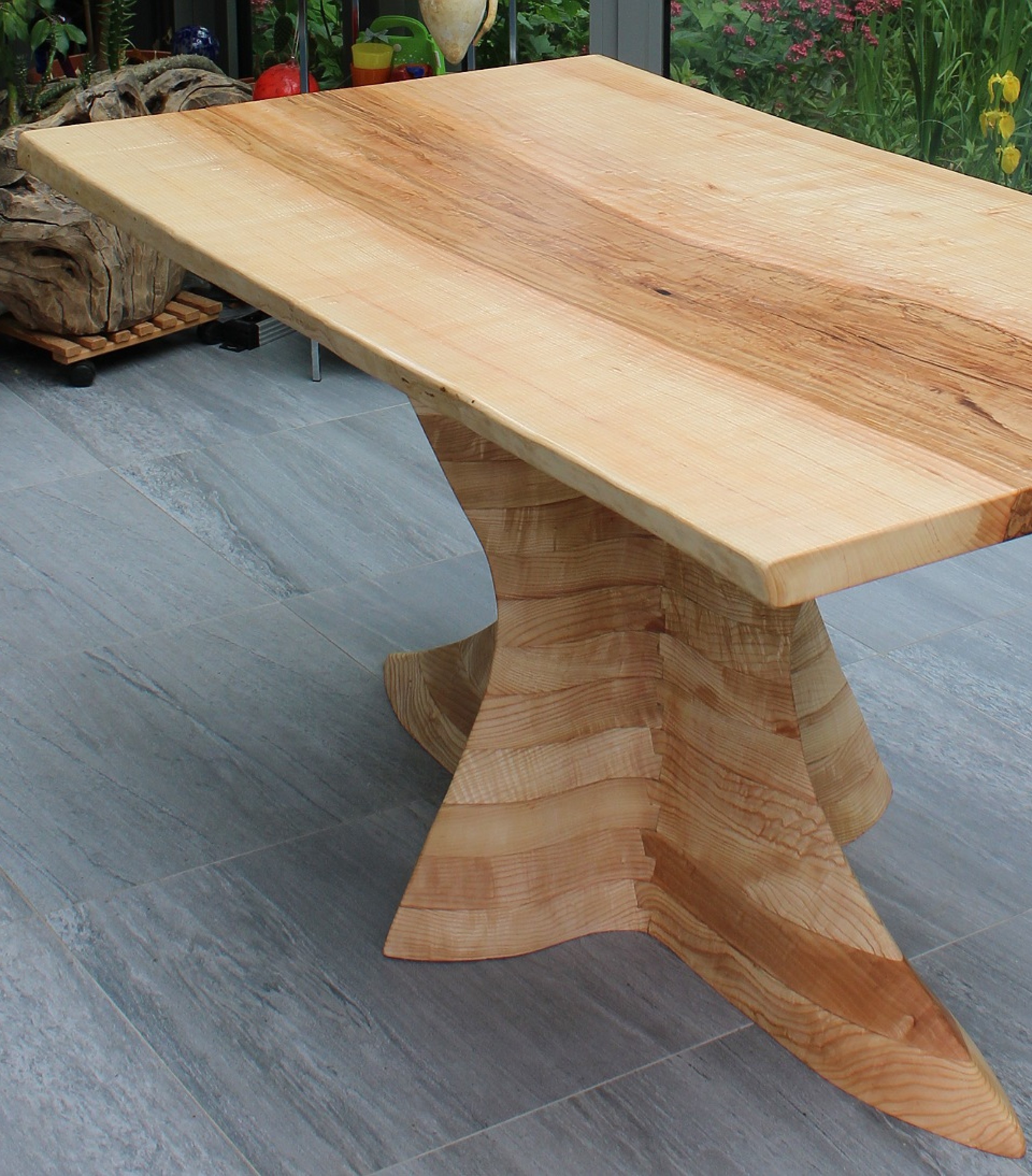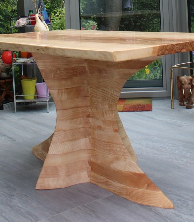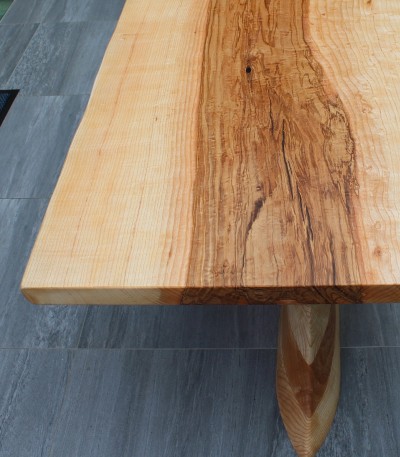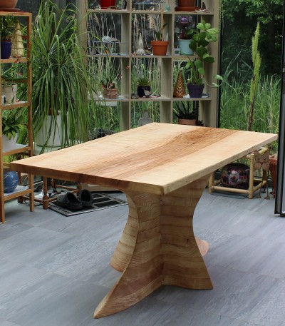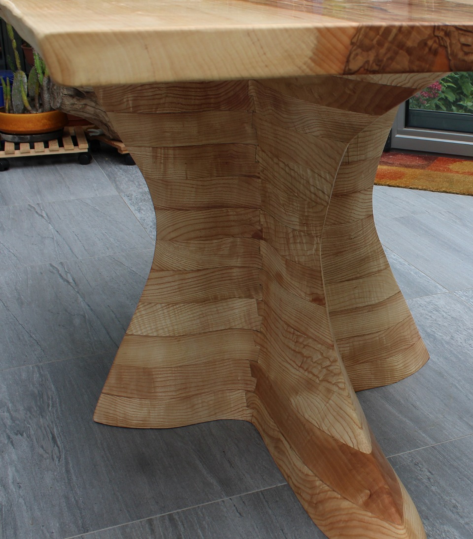Az eddigi leghosszabb és legkomplikáltabb láb projektünkkel. Megálmodni, megrajzolni is szuper volt, hát még elkészíteni. Az asztal lapja egy nem mindennapi színekben pompázó 90 cm átmérőjű kőris lap. A láb pedig a várva várt Velum projektünk. Kőris fából, teljesen tömör, 2 emberes súllyal, közel 3 hónapig formázva a végleges ívekre. A projekt célja az volt, hogy olyan lábat alkossunk, ami középen támasztja alá teljesen egyedi formában, nagyon stabilan az asztalt. Az asztal nem mozdul semerre, a látvány pedig élőben és szerintem képeken is lenyűgöző. Számunkra biztosan. Csodás helyet kapott a Bécs közeli kisvárosban egy csodaszép tóparti télikert központi attrakciójaként.